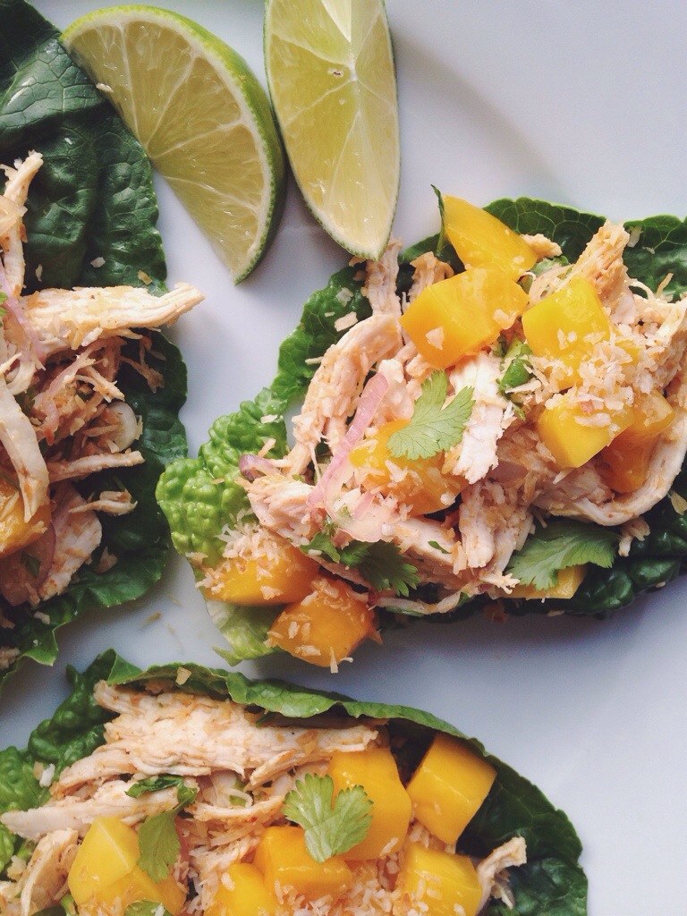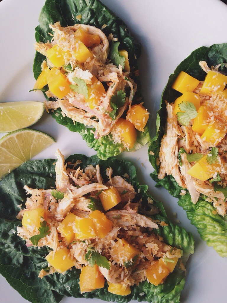 - Assemble each wrap with chicken mixture, mangoes and extra coconut on top. Enjoy!