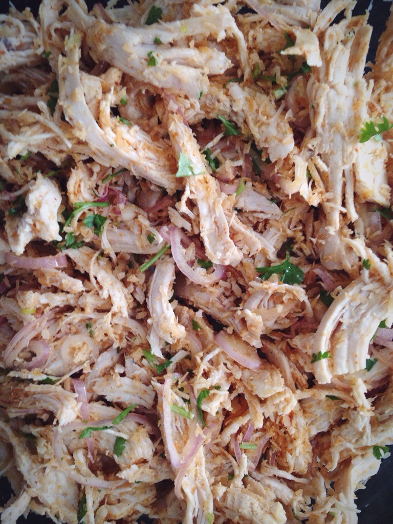 - Combine chicken, shallots, 2/3 coconut, cilantro, seasonings, coconut oil and lime juice. Mix well and add salt to taste.
