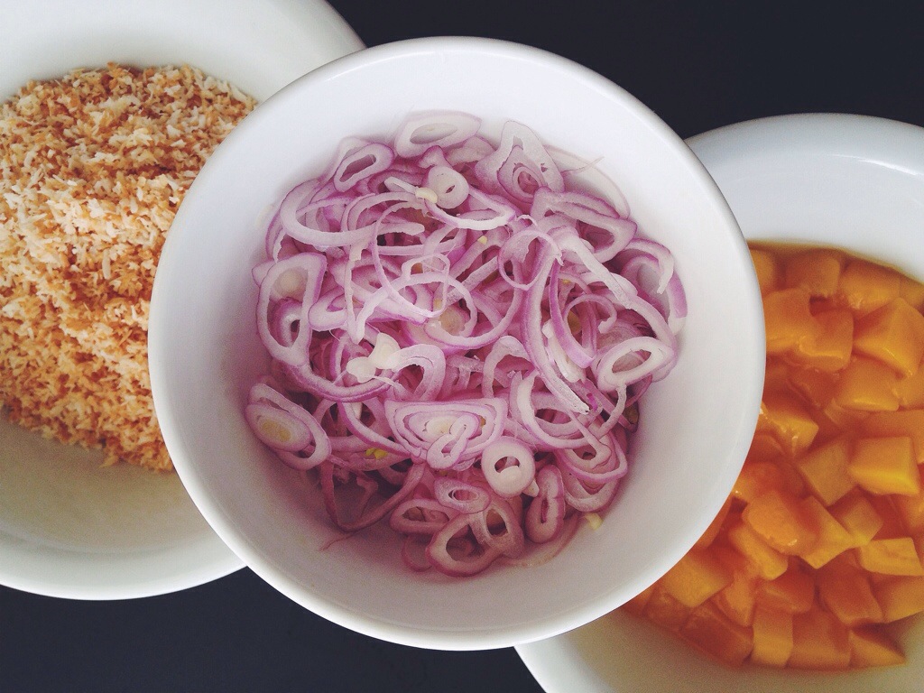 1 cup diced mango, I defrosted and chopped frozen chunks I use in smoothies in a bowl of water