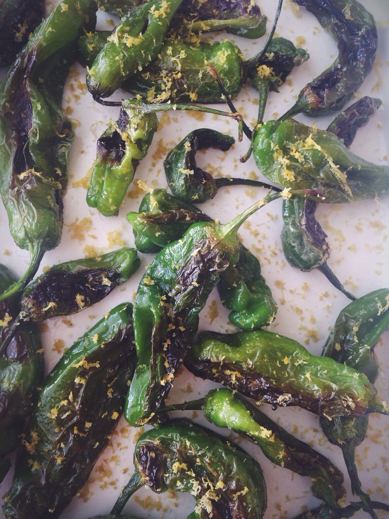 Ready for a delicious, unique and beautiful appetizer? Here it is. Blistered shishito peppers with lemon zest and sea salt. Have you tried them? Shishitos are everywhere at farmers markets in California right now and they are the perfect way to gobble up the last days of summer. They are a worth while recipe even in mid-August as they are quick and require little actual cooking, meaning no unnecessary heat in the kitchen. To make simply heat canola oil in a skillet until it glistens, add peppers and let them sizzle and pop until they start to blacken and blister. Turn a few times in the pan until done to your likeness and remove onto a paper towel to soak up any extra oil. Transfer to a bowl, add a small drizzle of toasted sesame oil and sea salt, toss to coat. Zest one whole lemon (I think the more zest the better) to finish and serve immediately. Oh and by the way, shishitos are usually mild but there can be the occasional hot one, you have been warned!