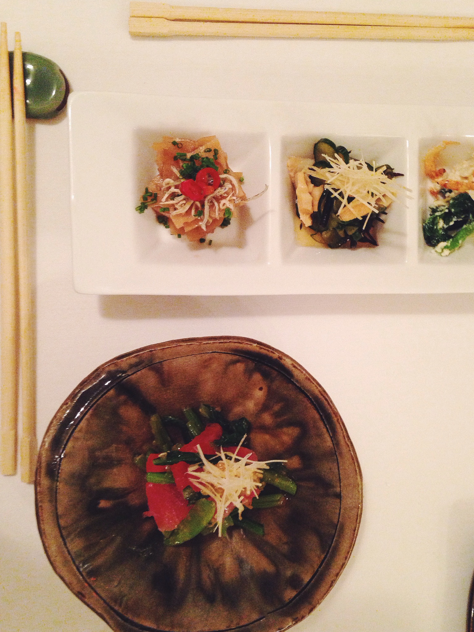 We each had a different tasting menu, his three tastes included soy infused daikon, tofu with greens and cucumber with scallop, mine was ahi with greens and ginger