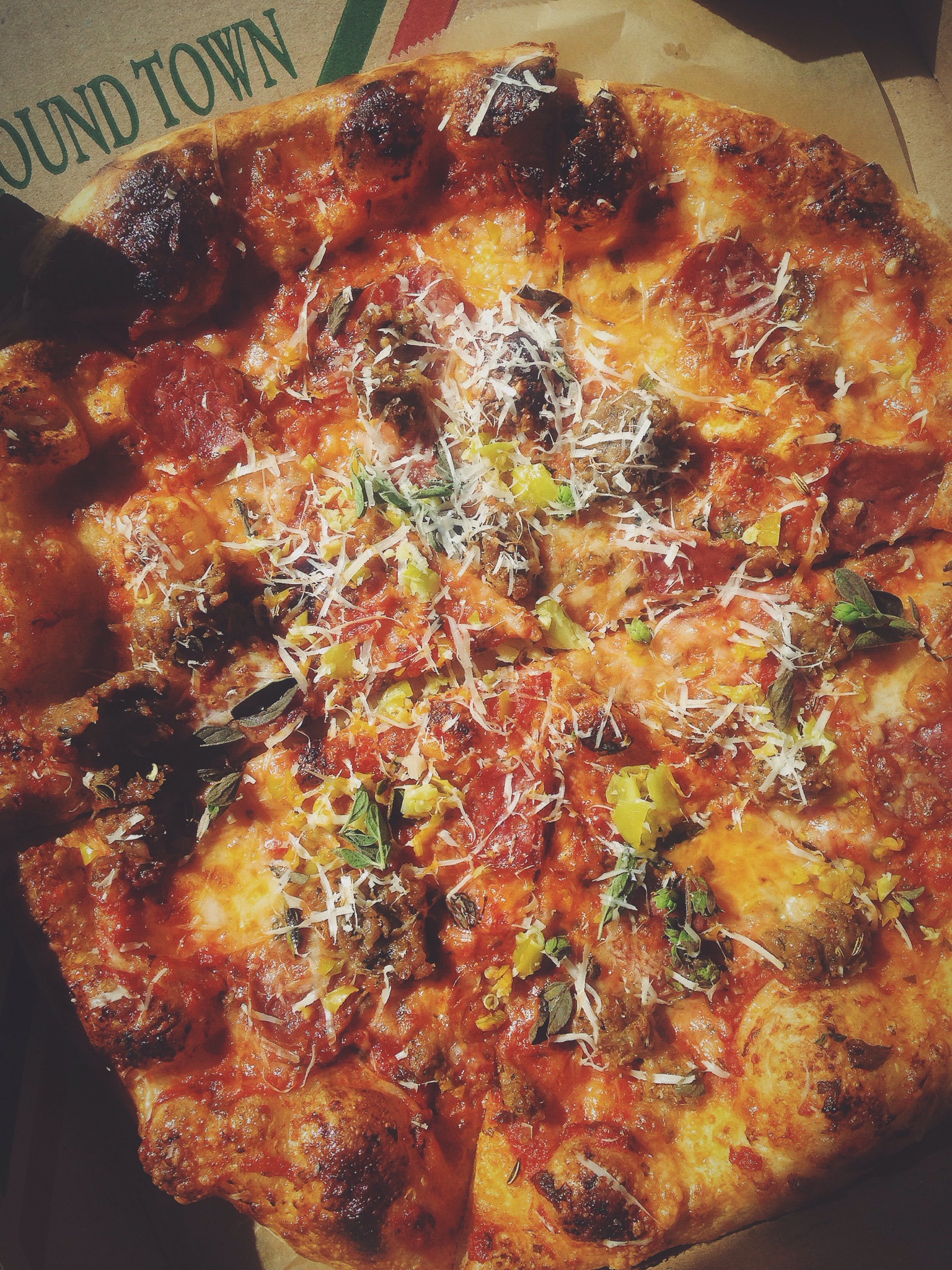 Ate a salad from the garden with our drinks and took the wood fired pizza to go, fennel sausage with herbs