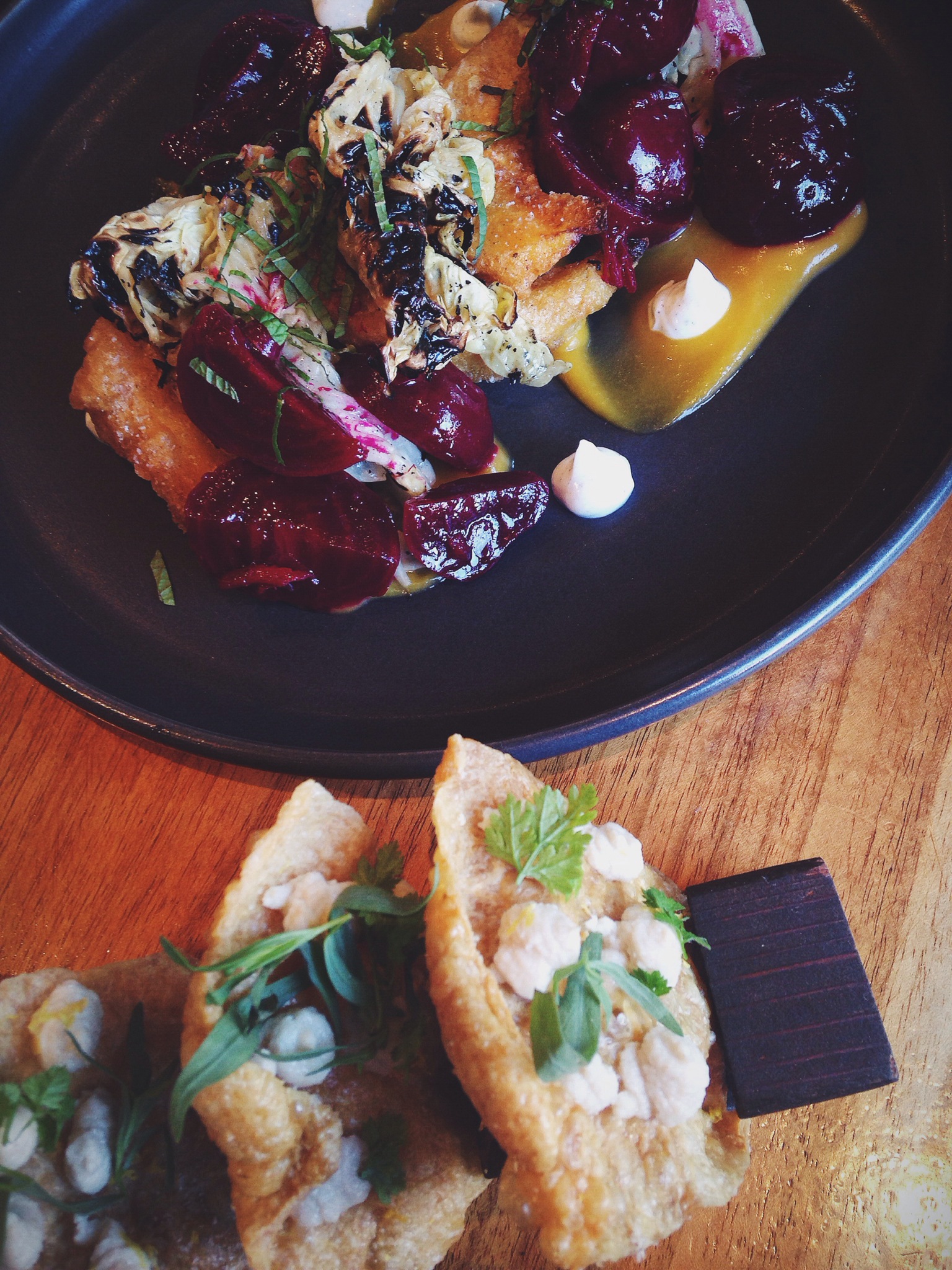 Chicken cracklings with oyster mushroom, lemon & tarragon along with roasted winter squash, fall fruits, grilled chicories, quince vinegar and beets
