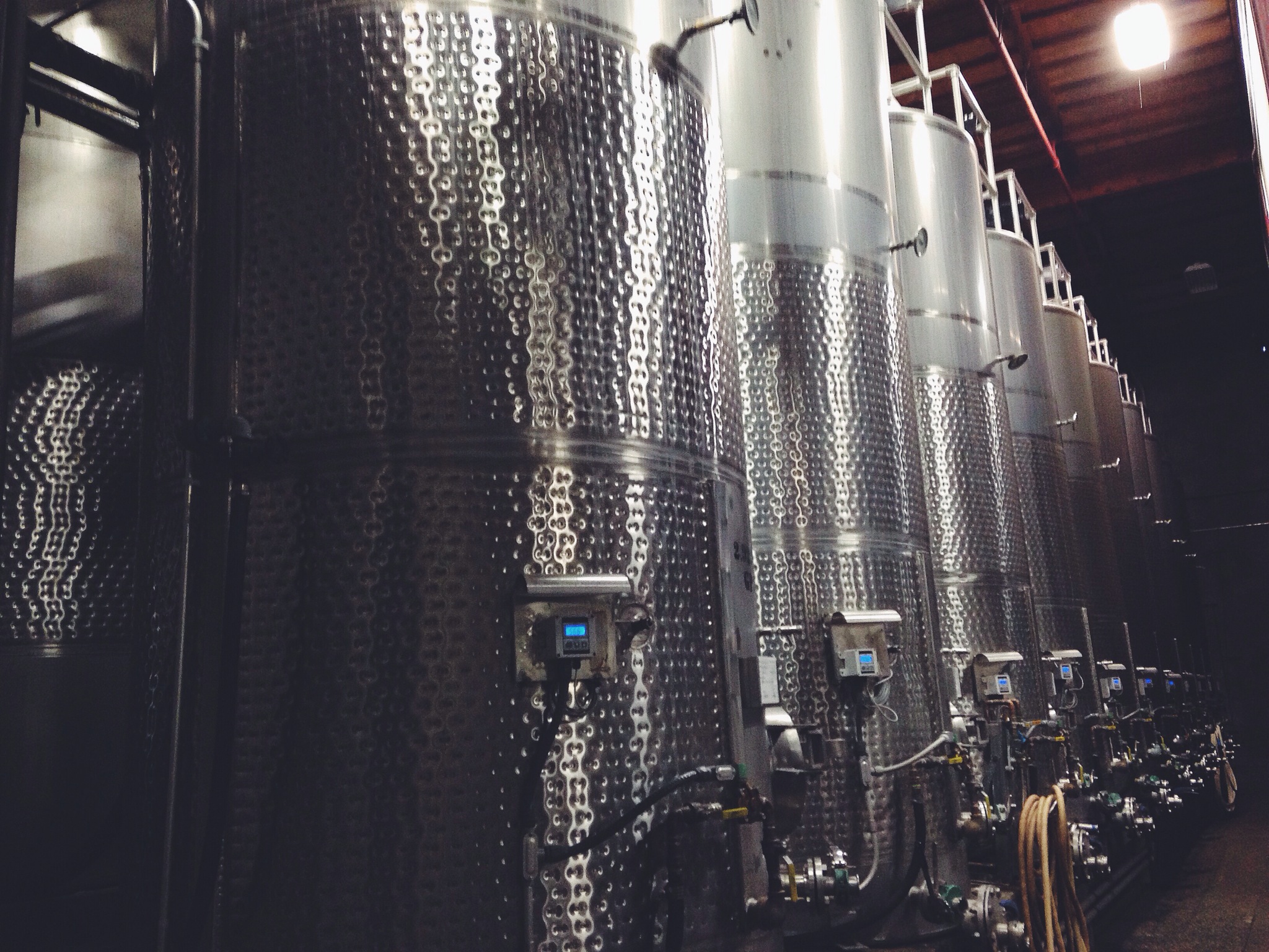 Fermenting tanks in the cellar are wrapped with cooling jackets (the textured bands you see) to help control temperatures and ensure proper fermentation for each style of juice