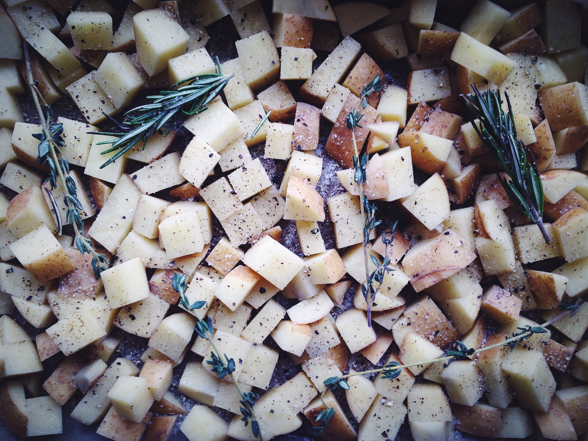 Dice potatoes and lay them out on a baking sheet lined with parchment paper. Drizzle with oil and generously sprinkle with salt and pepper. Incorporate fresh herbs and toss to coat. Wrap up and store in fridge until morning of brunch. Set out on counter while oven preheats and throw them in about 5-10 minutes before the quiche to allow them to get more browning time. Cook in oven with quiche for 30 minute quiche cooking time, removing once or twice to toss. The potatoes should be nicely browned when done. Check seasoning and add salt and pepper if needed.