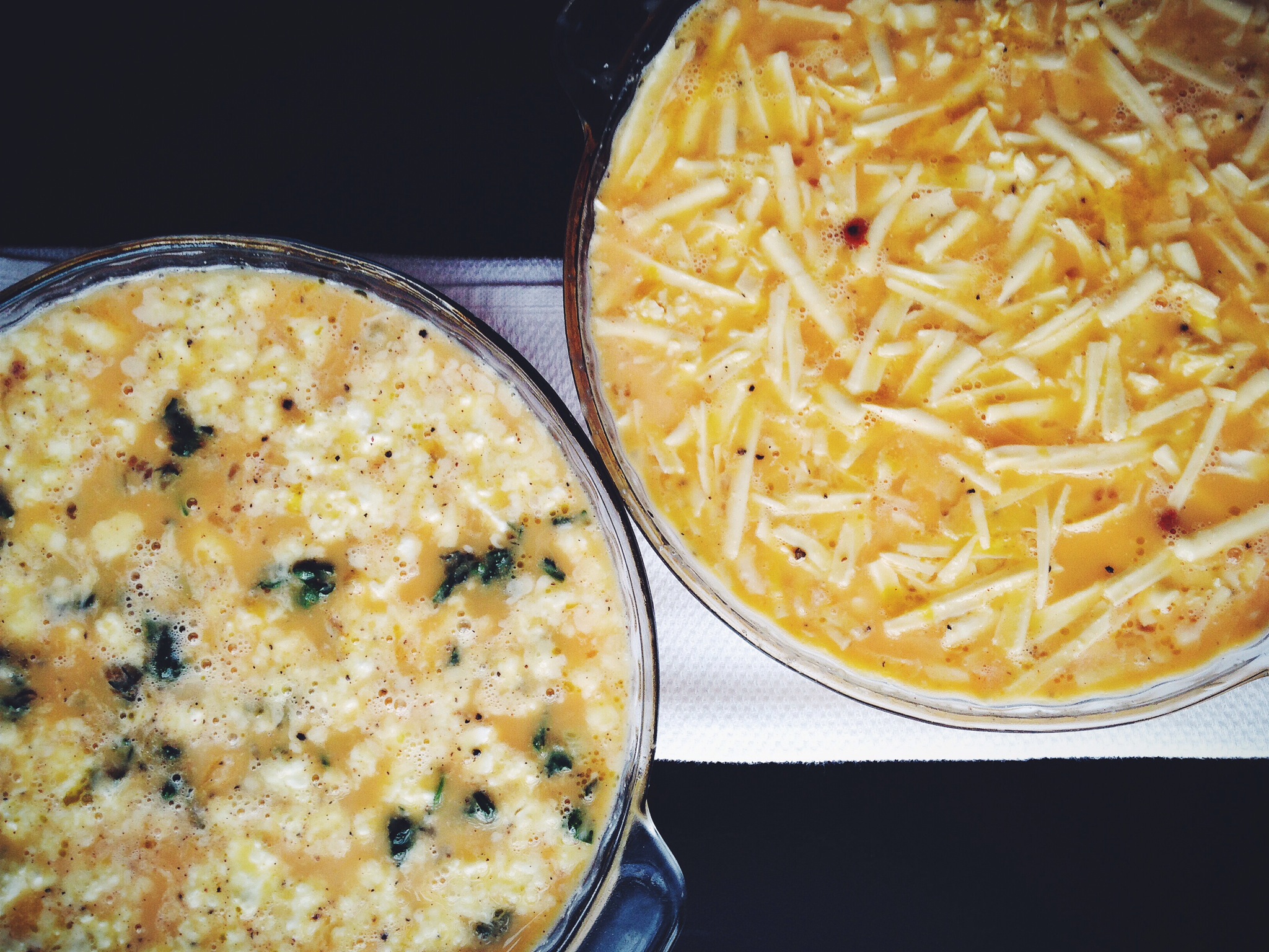 1. The night before brunch cook the inside goodies of your quiche, make the egg mixture and assemble but do not cook your quiche, also chop and assemble potatoes but do not cook, cover everything and refrigerate for morning
