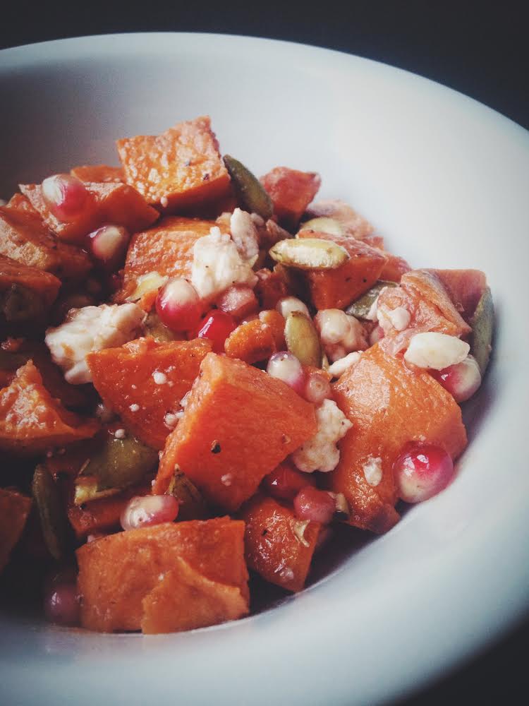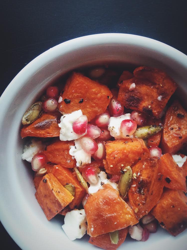 Sweet Potato Pomegranate Salad, adapted from Two Peas and Their Pod, serves 4-6 as a main, 6-8 as a side