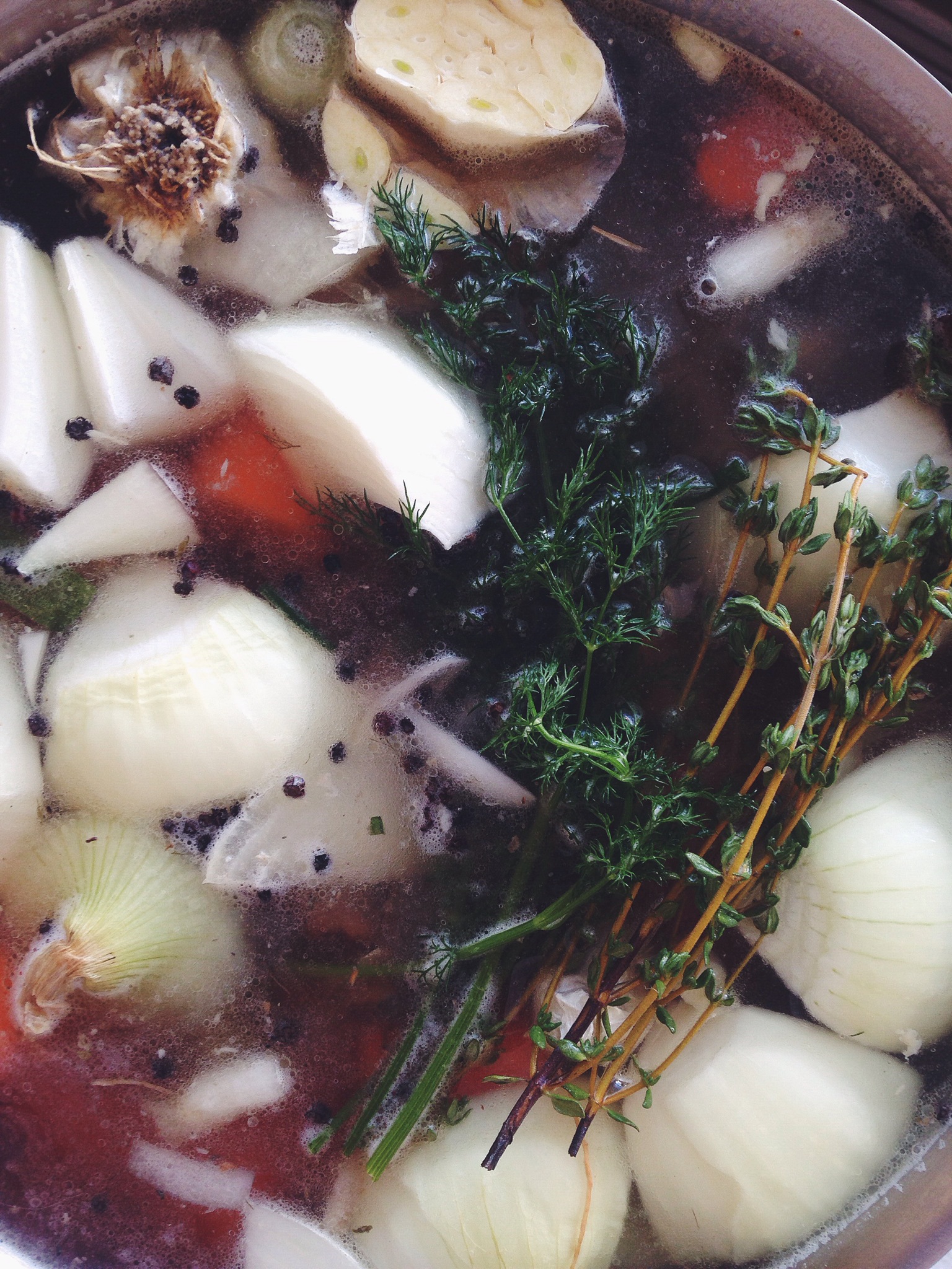 Here’s the trick, when I buy a rotisserie chicken I remove all the meat from the bones and put the remains into a large sealed bag I keep in the freezer. As I cook over the next few weeks I add stray garlic pieces, onion and carrot pieces or any extra bits of vegetable that could add to the flavor of stock. Once I have a full freezer bag (usually two chickens worth) I throw everything in my largest stock pot, fill it to the top with water and throw in some or all of the following depending on what I have stored up in the bag: