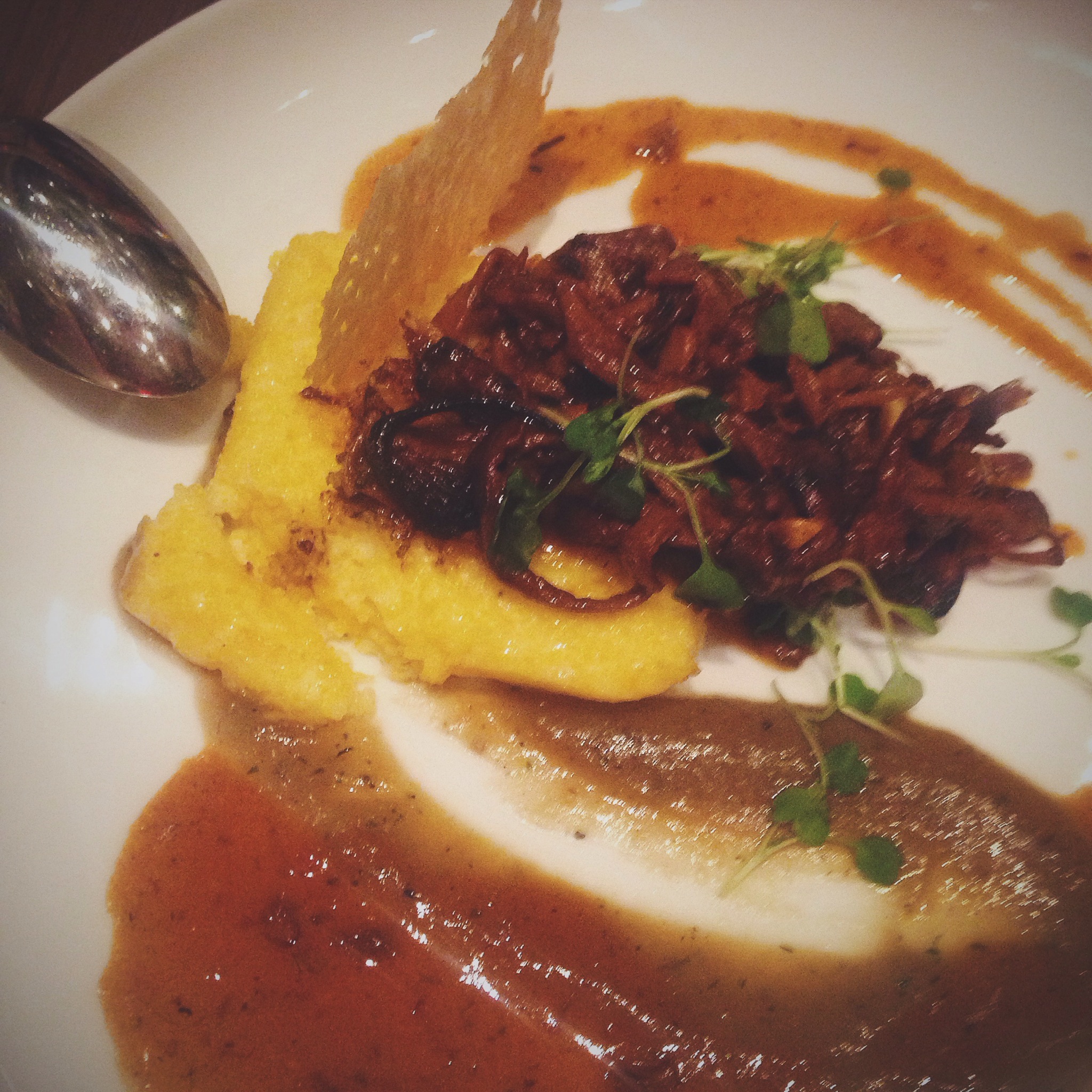 Seared Polenta with wild mushroom, vegetable demi-glace, cheese crisp