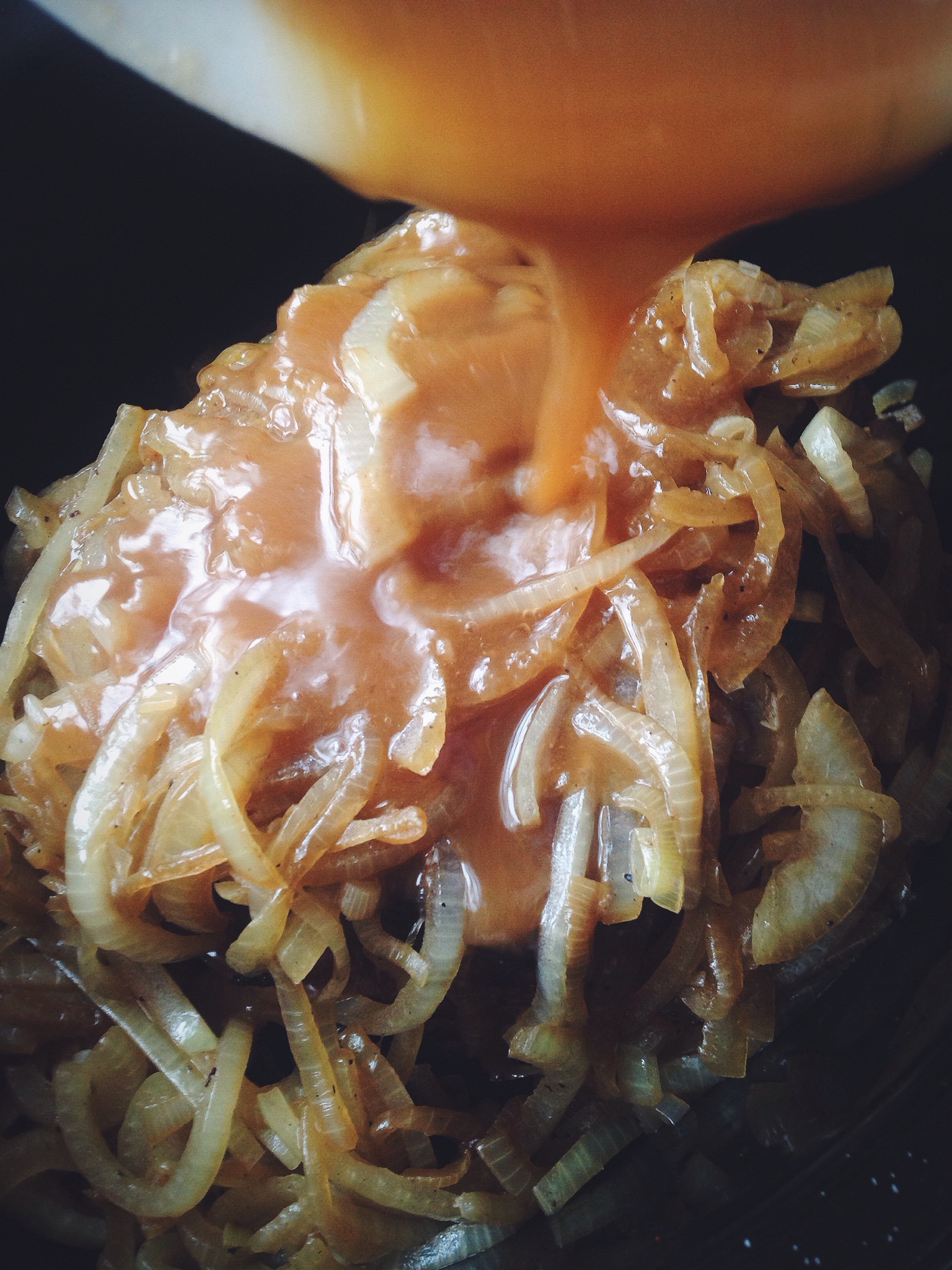 Back to the skillet…reserve 2 tablespoons of the meat fat in the skillet or dutch oven and reduce heat to medium. Add the onions and cook until starting to soften, about 5 minutes. Pour in your leftover tablespoons of chicken stock and bring to a boil, scraping up any of the brown bits from the bottom of the pan. Pour the onions and pan juices into the bowl of the slow cooker. Now add the maple dijion mixture over the roast. Close the lid and cook on LOW heat until the meat falls apart and is incredibly tender, about 8 hours.