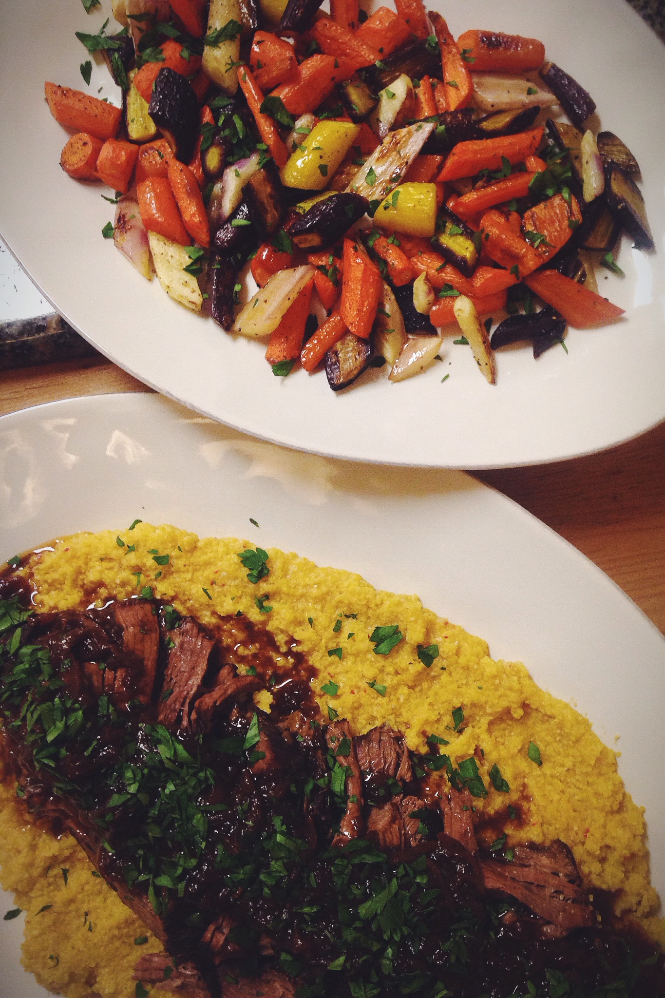 -once ready to eat, pour the polenta onto the base of your largest serving platter and top with cut pieces of the roast, spoon gravy mixture on top, move carrots to their own serving platter, and dress salad
