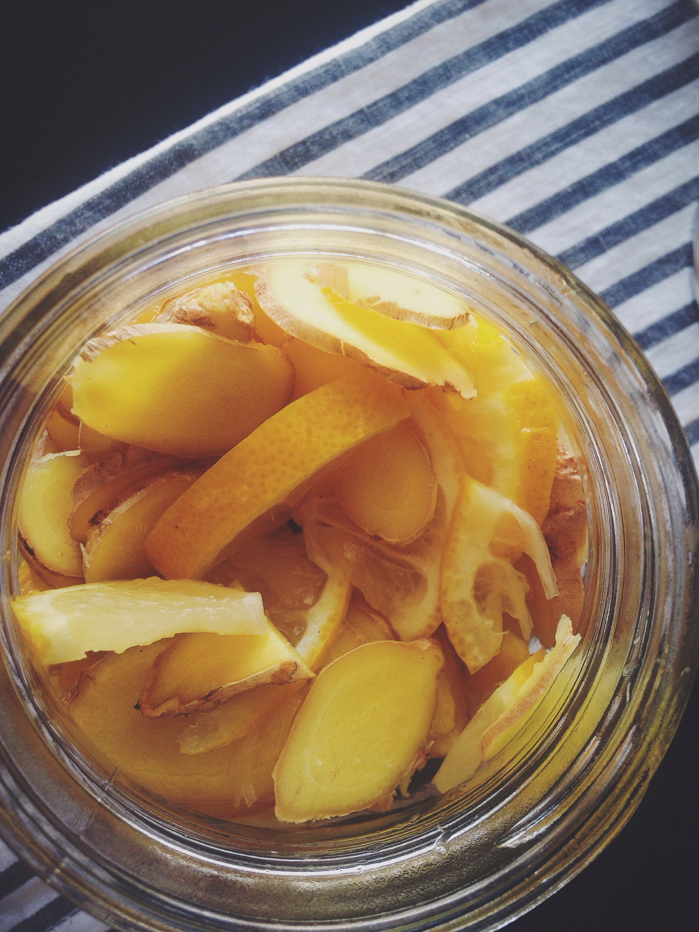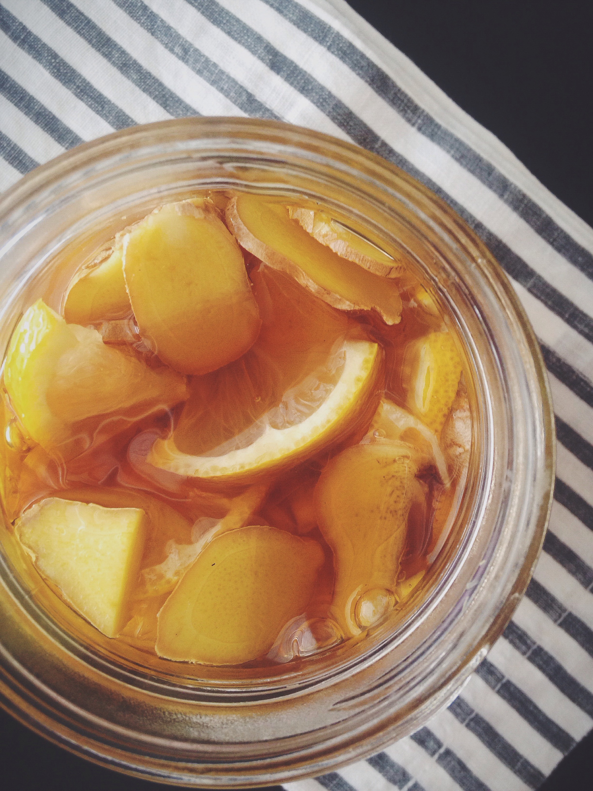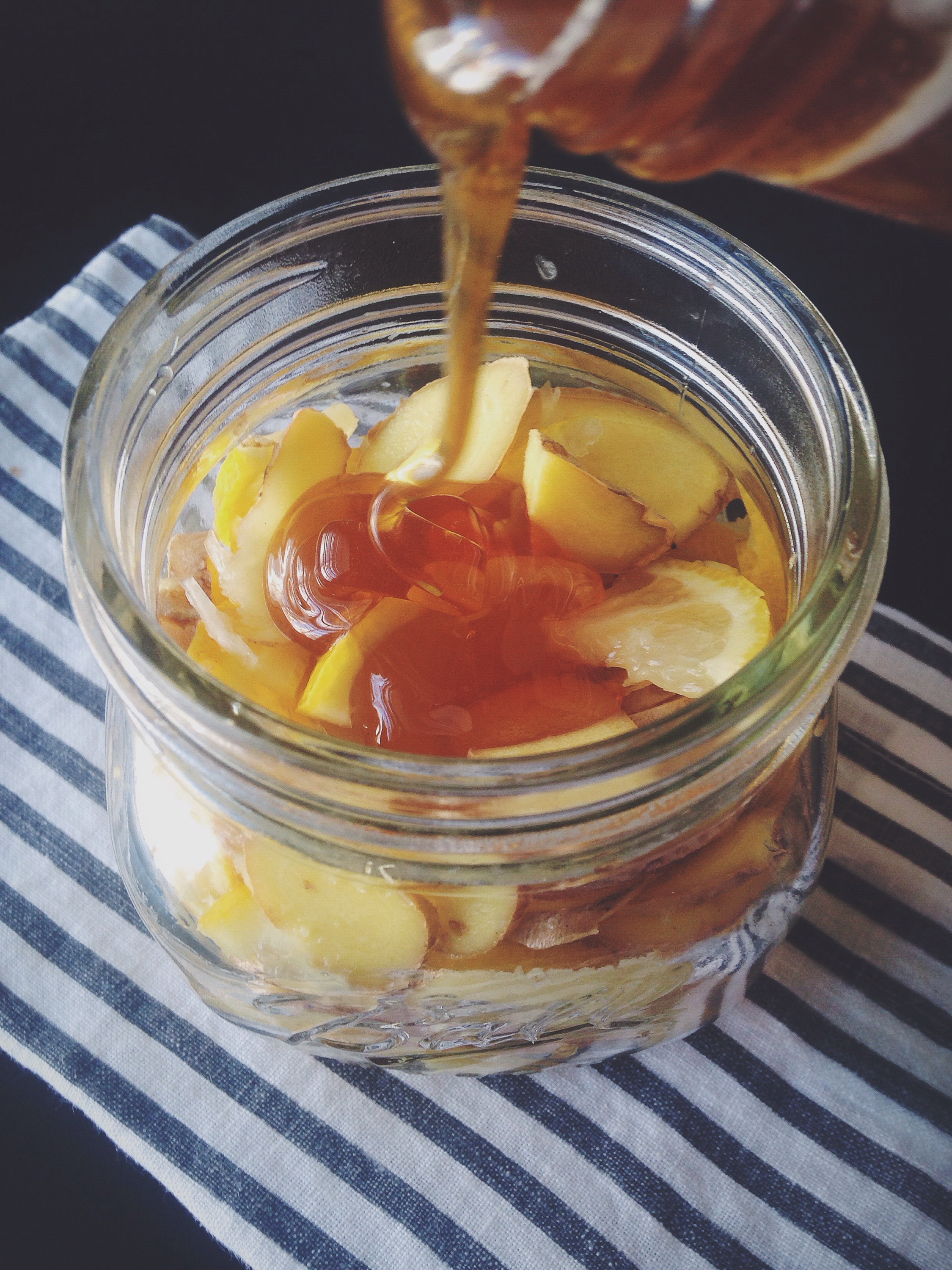 It sure seems like everyone I know is in some stage of sickness. Whether getting over it or coming down with it, when you’re the one dealing with the nasty crud your days can feel really long and tough. There’s been at least four times in the last few months I’ve been on the verge of sickness but thanks to rest, some extra clean eating and added cold busters I’ve managed to escape it. If you happen to be in any stage of sickness this cold buster tea is LEEEGGIT. First of all, it reminds me of the lemon flavored Luden’s “cough drops” (let’s be real, more like candy, love them)…delicious! More importantly this tea is made of nature’s best medicinal goodies, lemon, ginger and honey. It also couldn’t be easier to make. Thinly slice up a lemon and a piece of ginger about the same size (no need to peel either) and cover with 1 cup of honey. Seal with a lid and let sit in the fridge overnight. Stir up and add a tablespoon of the liquid to a mug of hot water and you’ve got yourself a cup of cold buster tea sure to make you feel back to your normal self in no time.