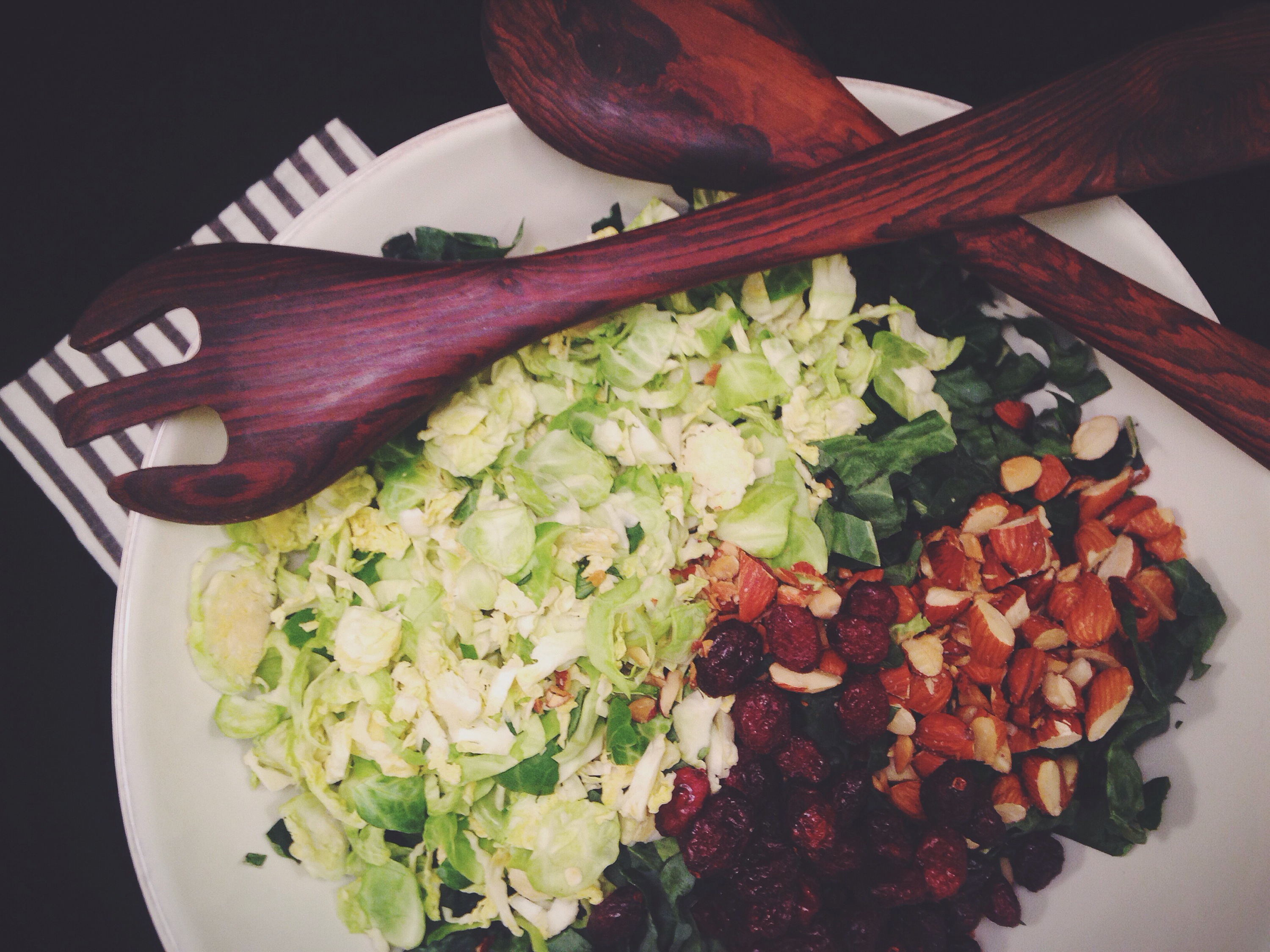 A few years ago my sister in law brought a salad to Thanksgiving dinner. Big whoop, right? The salad tends to be the requirement at the table when it comes to an exciting meal like Thanksgiving. But this salad was different. This salad was packed with flavors like crisp citrus notes from the lemony dressing and bright pops of sweetness thanks to a handful of dried cranberries. It didn’t hurt that the base was super healthy thanks to raw brussel sprouts and kale. I think that was the first and only year I’ve ever done seconds and thirds of salad over gravy and potatoes. The recipe has since spread to many of my friends and is a favorite of everyone’s. The best part about this salad is it can stay fresh in the fridge for several days even after dressing, in fact it gets better. A great make ahead grab and go lunch for the week if you want a healthy meal you will look forward to eating.