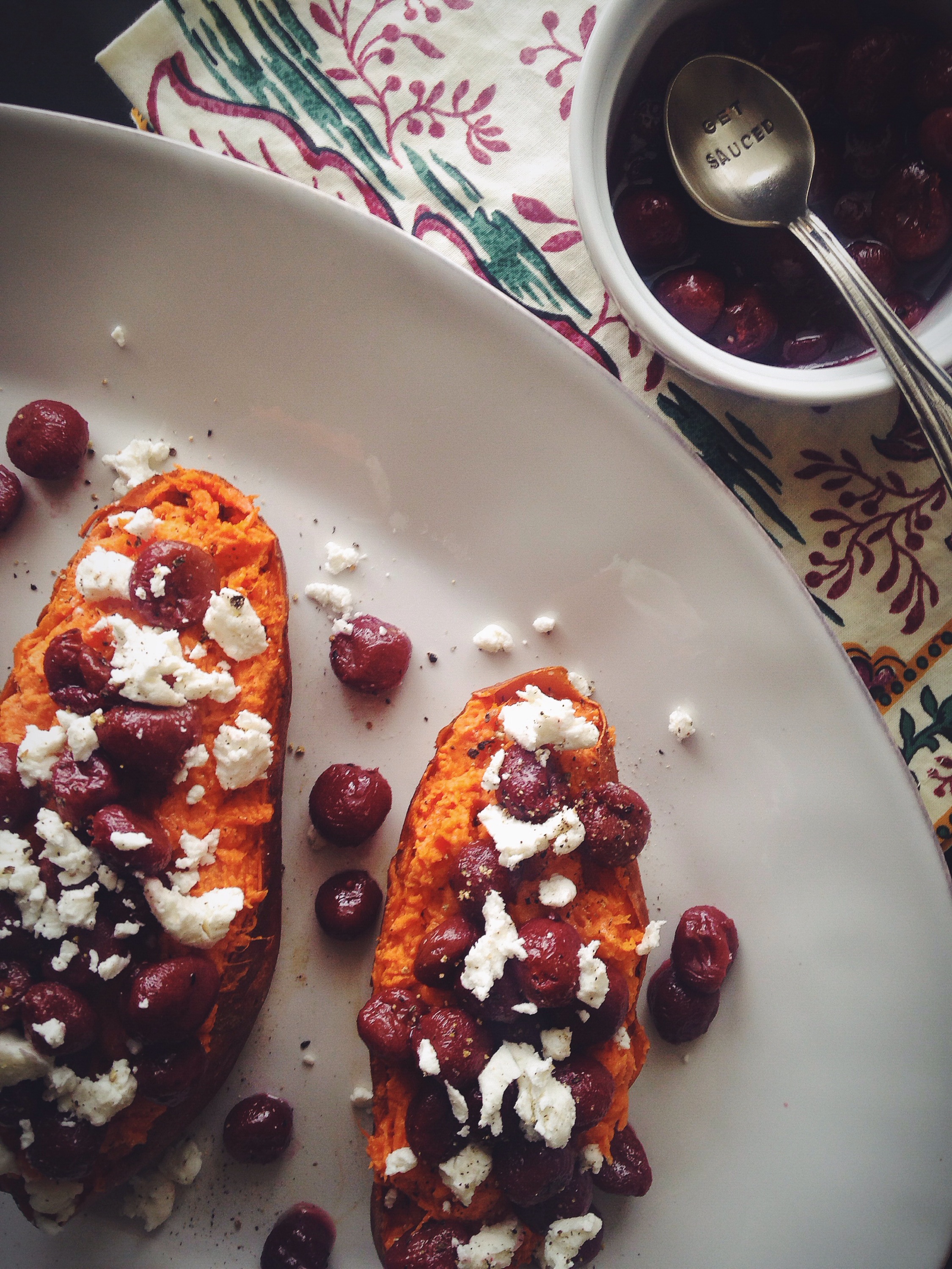 Sweet Potatoes with Roasted Grapes, Goat Cheese and Spices, recipe courtesy of How Sweet Eats