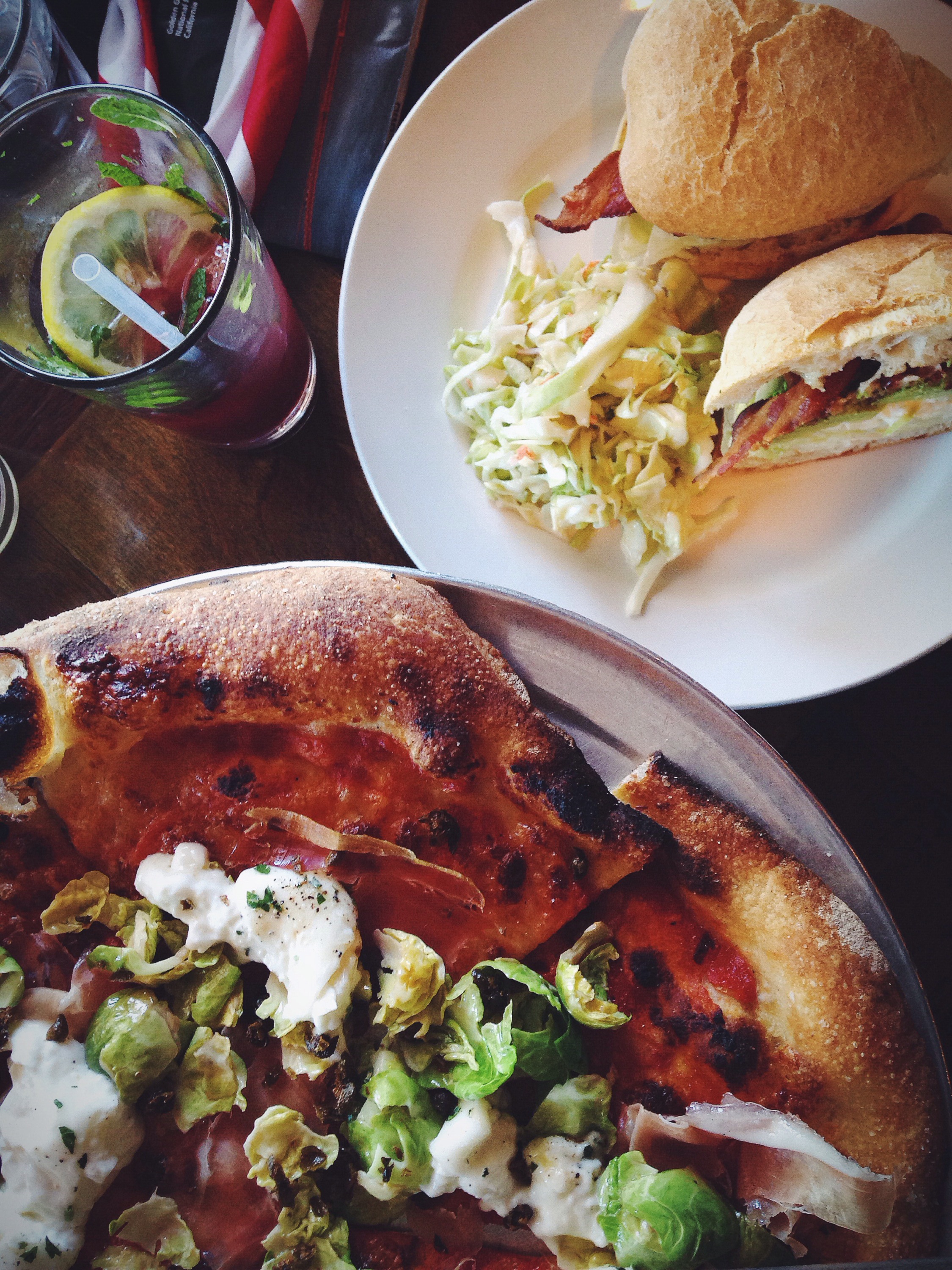 Woodfired pizzas. This one was speck, fried capers, burrata and brussel sprout leaves.