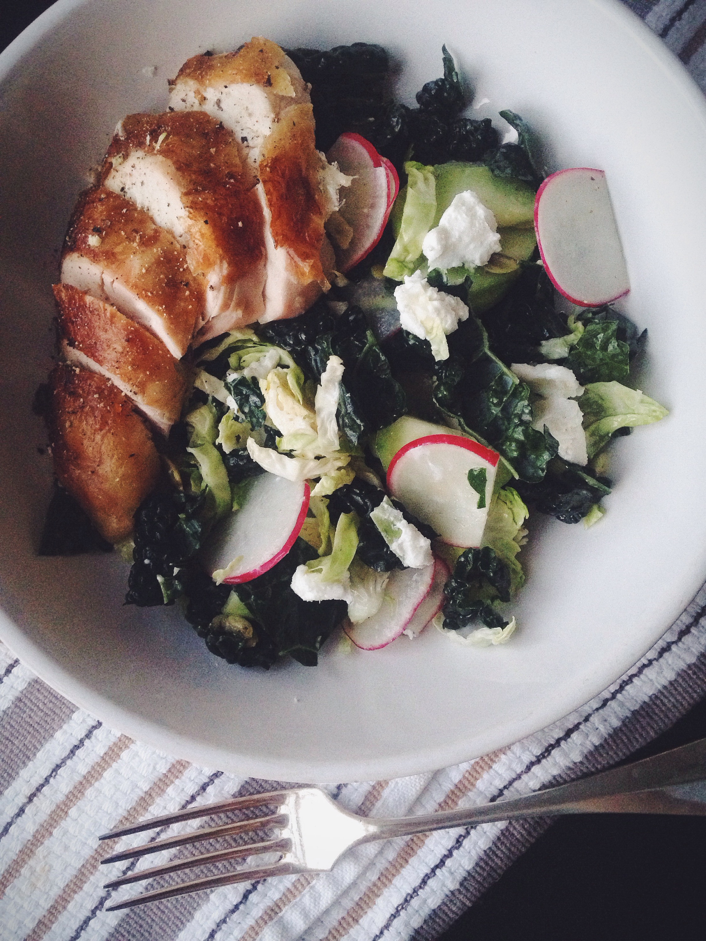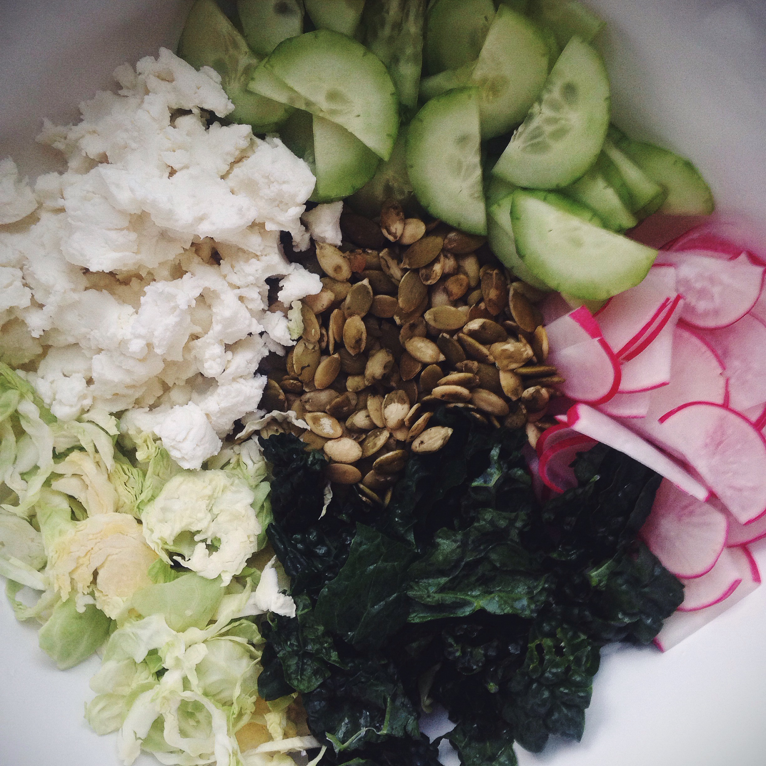There is nothing special about this salad. It’s just a version of a chop chop (all items chopped to bite sized pieces) with cucumbers, radishes, goat cheese, pepitas and pulled chicken. But what is special is the fact that you can eat this salad for dinner and then the next day again for lunch, saving you lots of precious time in your day. The key is using a combo of kale and shaved brussel sprouts for your base. In fact, the greens tend to get even better the next day as they have time to breakdown a bit which makes them easier to chew. I like to make a huge salad for dinner and before diving in set aside a to-go container for the next days lunch or even a snack if I have the munchies. This approach takes all the guess work out of eating healthy and gives you back time in your day, a winning scenario.