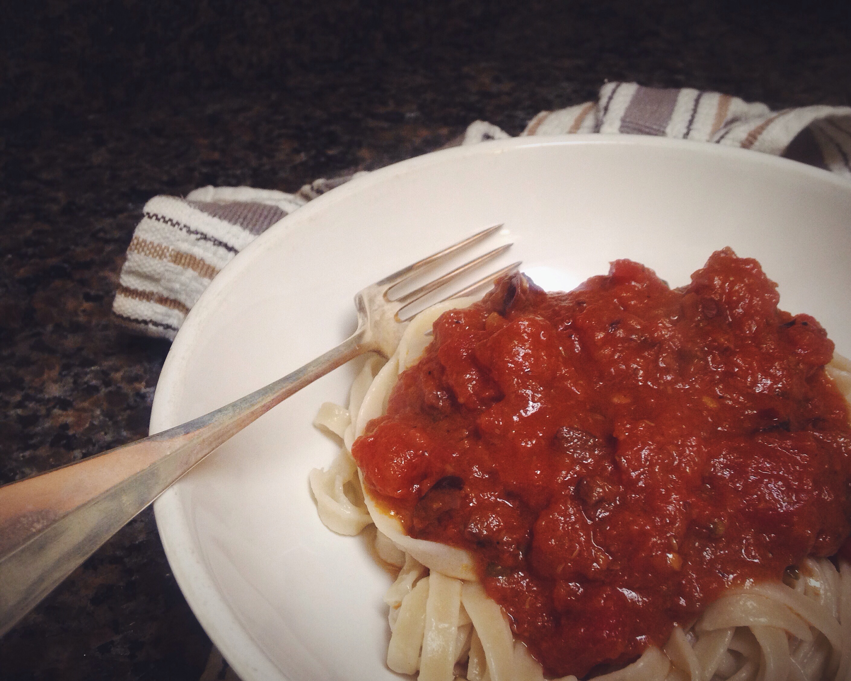 - Drain noodles and add them to the sauce in in the pan, or as I prefer, bowl up the noodles and spoon ridiculous amounts of sauce on top, enjoy!