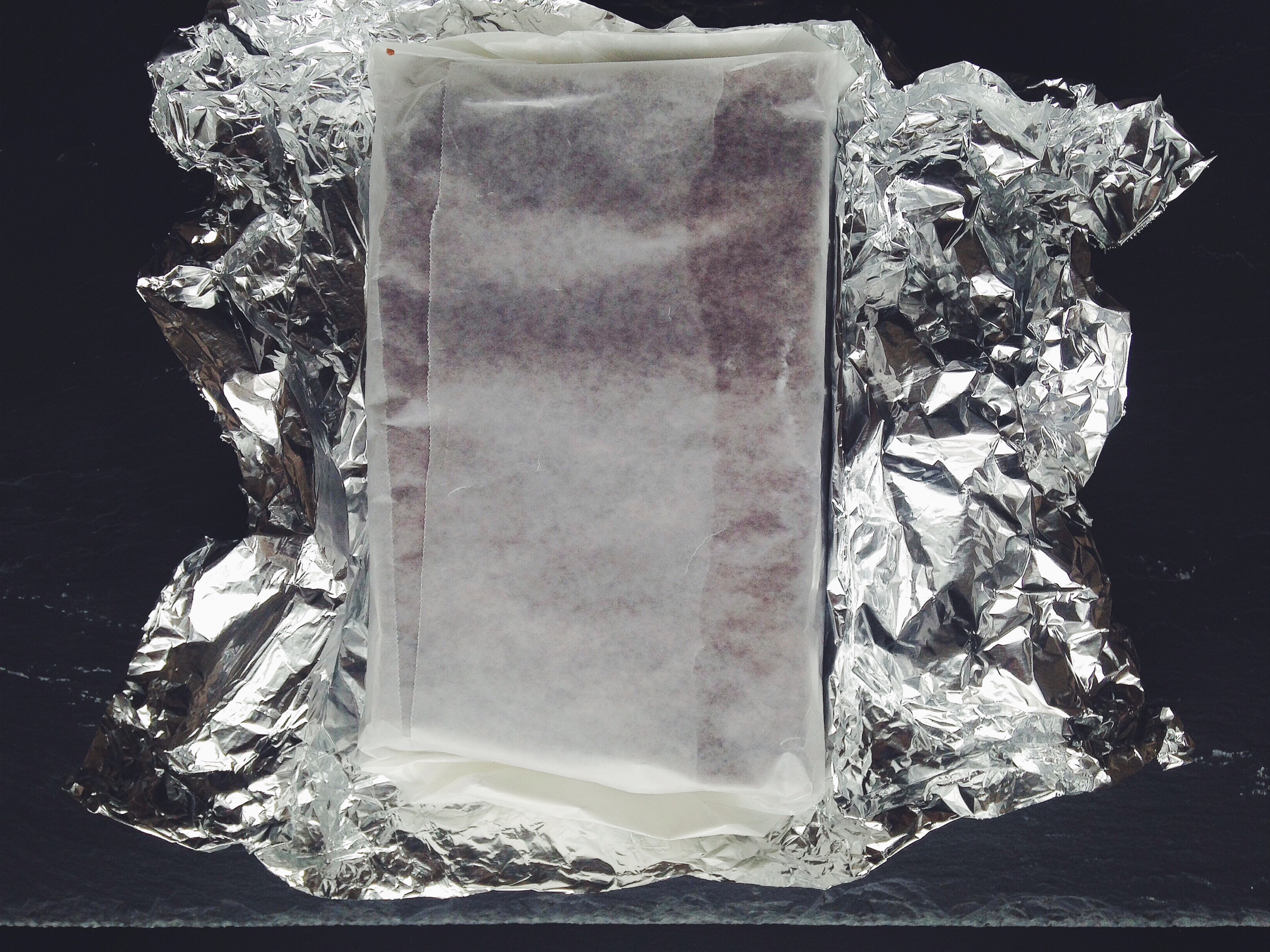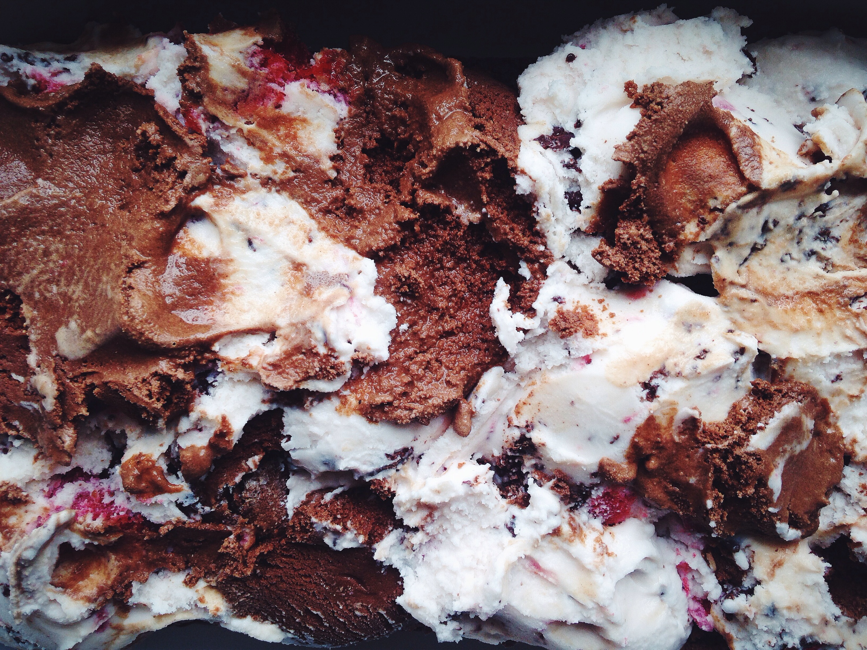 If you used one pan, remove from freezer and cut brownie in half, working quickly, cover one side of cut brownie with ice cream. I did this in a patchwork of each flavor. If using two pans add ice cream to one side and then add other brownie as the ‘top’. Carefully press the top firmly down and wrap tightly in parchment from baking pan. Return brownie-ice cream stack to freezer until fully firm, another 30 minutes. Transfer the ice cream sandwich block to a cutting bard. Cut into squares — and either store in an airtight container or bag in the freezer as-is, or individually wrap in waxed paper and foil. They should keep for at least two months in the freezer.