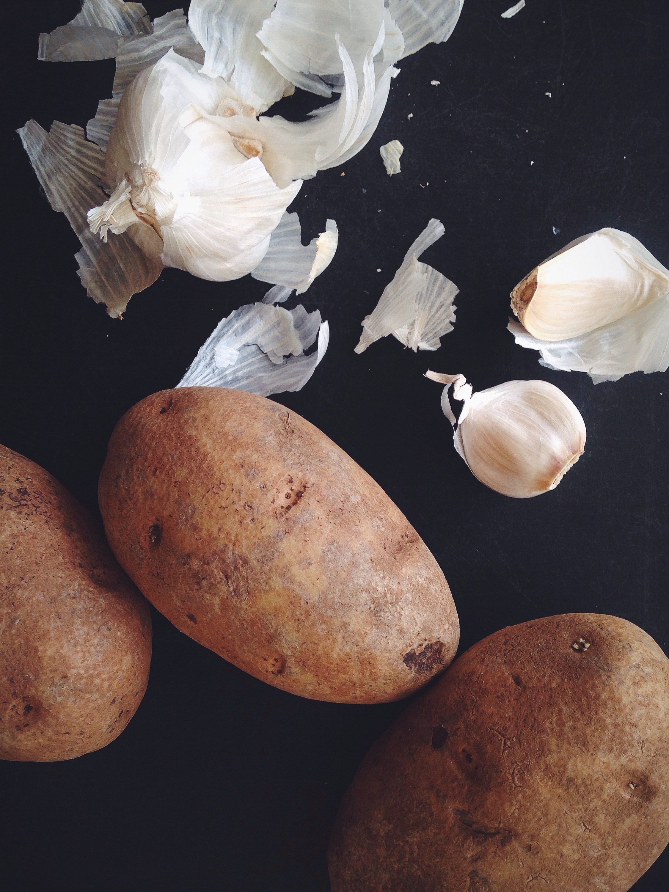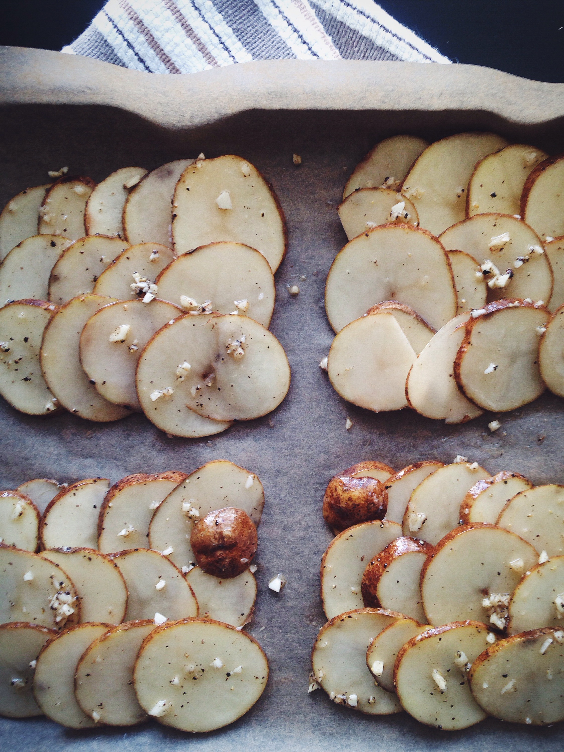 Preheat the oven to 425°F with a rack in the center position. Line a sheet pan with parchment paper. In a large bowl, toss the potatoes with the olive oil, garlic, salt, and pepper until thoroughly coated. Assemble 4 potato rafts by overlapping potato slices on the prepared pan in rectangular mounds. Each raft should consist of 3 or 4 shingled rows and be roughly 4 x 6 inches; use 3 or 4 slices of potato per row. Roast the potatoes, rotating the pan halfway through, until golden brown and beginning to crisp, about 30 minutes. Remove the pan from the oven.