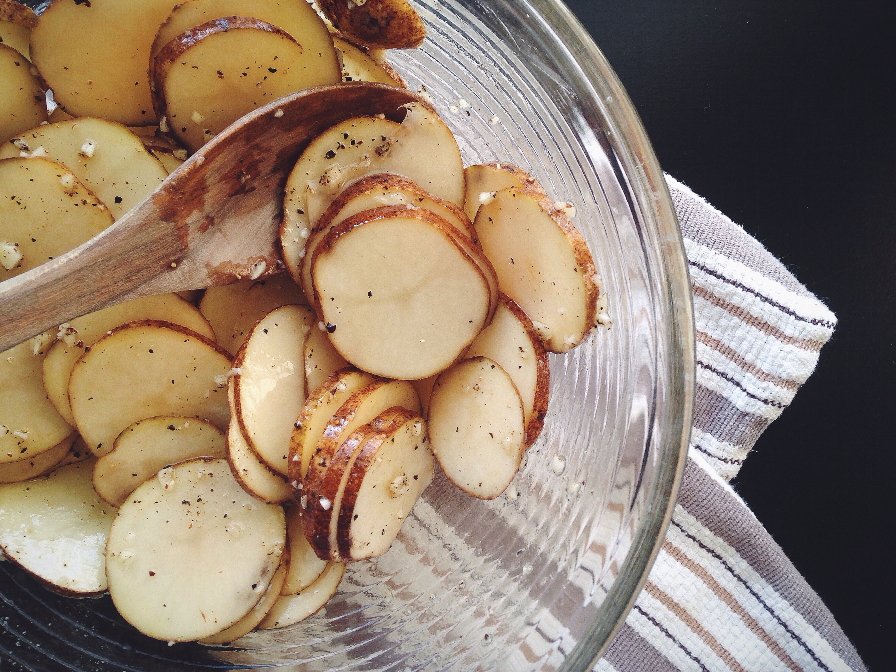 1 1/2 pounds russet potatoes (about 2 medium), unpeeled and scrubbed, sliced into 1/4-inch-thick rounds