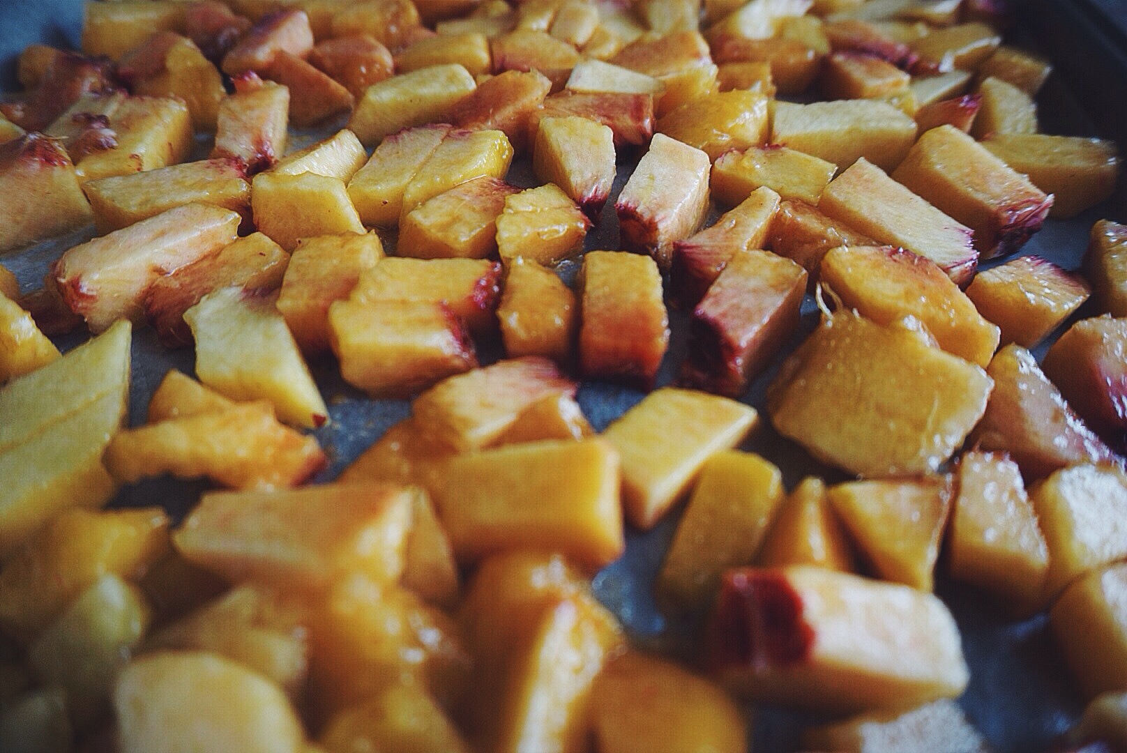 Note: original recipe calls for sugar but you really don’t need it when the peaches are in peak season. If a sweeter taste is preferred I suggest adding a drizzle of honey or maple syrup.
