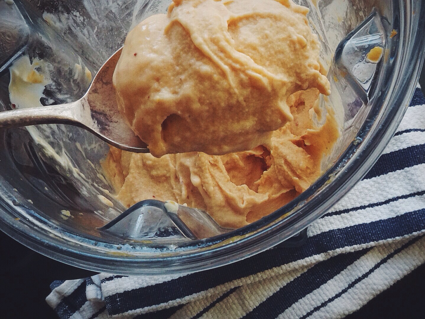 Spread the diced peaches into a single layer on a parchment paper lined baking sheet. Freeze for a few hours. Add to a high power blender along with your dairy of choice and blend until smooth. May need to add a splash of water or two to get it moving but try to refrain. Once smooth serve immediately for best results and true gelato like consistency or add to a sealed container and freeze for a more frozen treat. If stored well can stay good in freezer for 5-7 days.