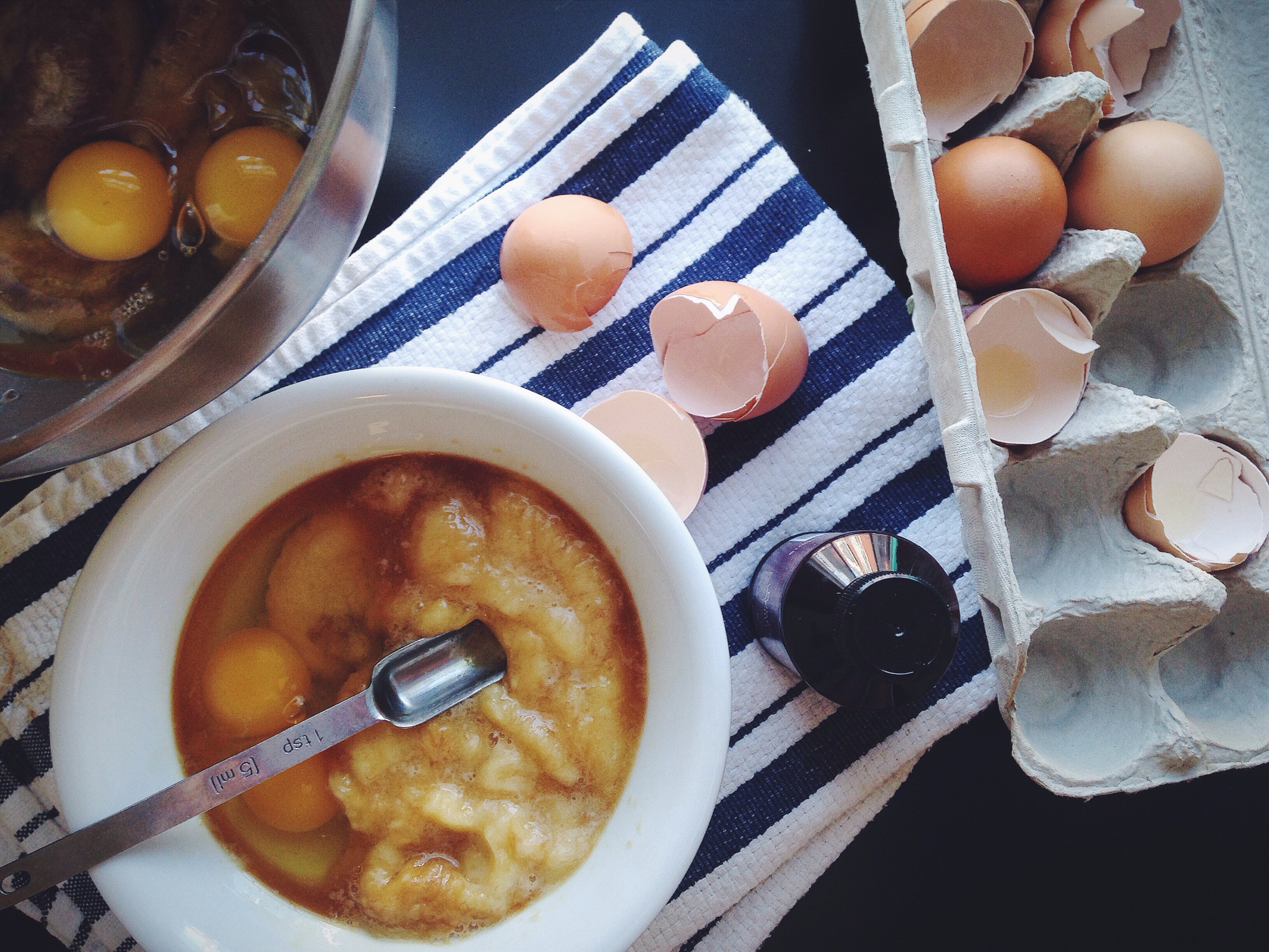 In another bowl, stir together the maple syrup, eggs, coconut oil, and vanilla. Be careful to temper the coconut oil into the mixture so you don’t end up with scrambled eggs. Add the bananas and whisk until everything is combined well (I used my electric stand mixer and it was a breeze).