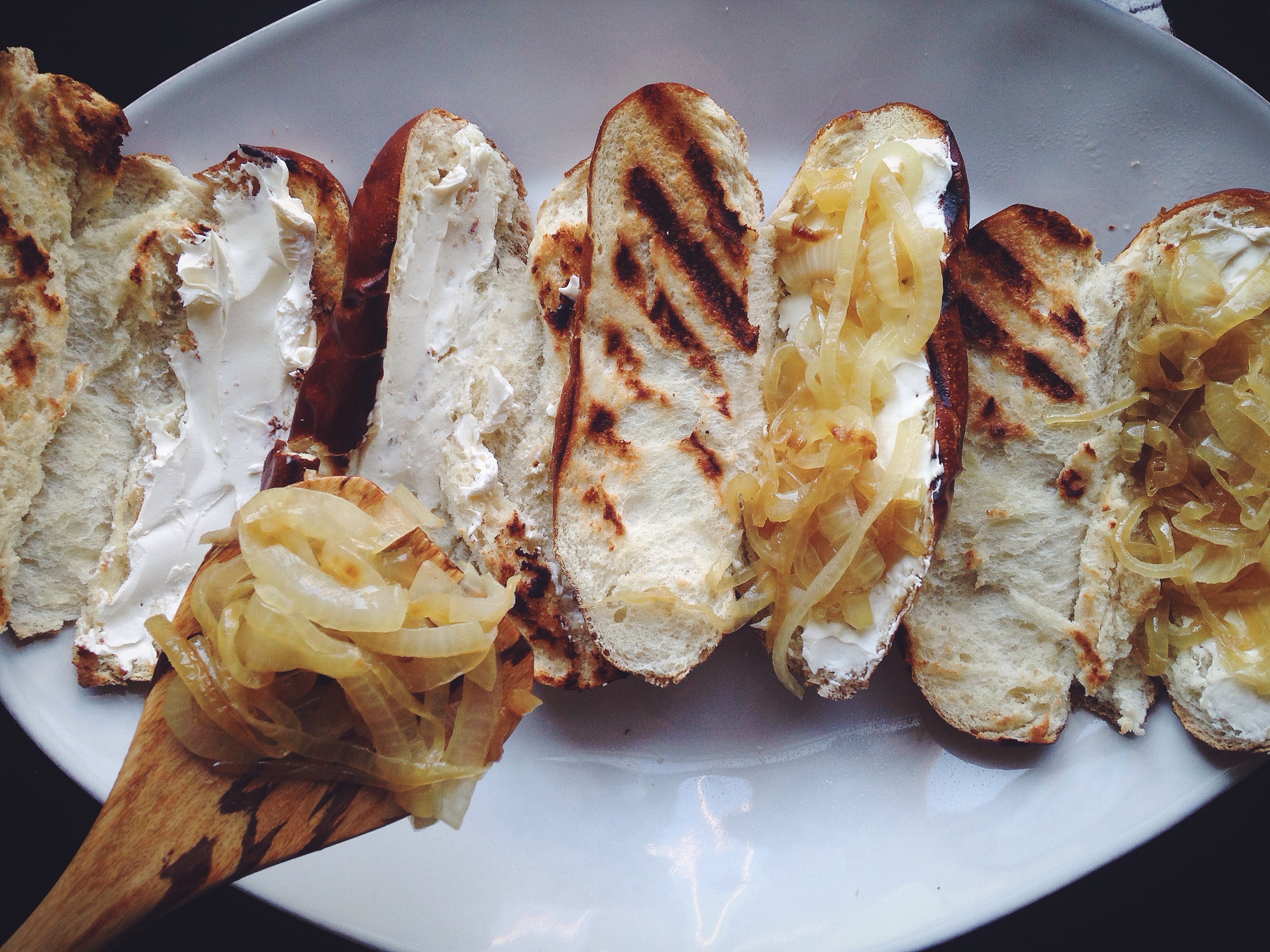 Start by taking the cream cheese out of the refrigerator to soften as you cook. Cut the onions in half and slice into thin half moon shaped pieces. Add onions to a cast iron skillet with 1-2 tablespoons of olive oil and give them a generous sprinkle of salt. Cook on medium low, only stirring occasionally, for 20-30 minutes while you prep the rest of your dinner. Now cut buns open and give a light spray of cooking spray to help crisp up on the grill (optional, can also grill them dry). Cook the sausages according to the package directions, mine came precooked so I just heated them on the grill pan and added some nice grill marks. Place the buns on the grill (or grill pan) with the inside facing down. Once the buns and sausages are cooked and nicely marked remove from the grill and add a very generous spread of cream cheese to one side of the bun. Top the cream cheese with grilled onions and finish with the sausage. Assembling them this way uses the cream cheese to prevent soggy buns. Enjoy and be prepared to have a new game day favorite.
